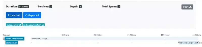 }以下是 gRPC 客户端代码。它首先调用上面提到的函数 “newTrace()” 来创建跟踪器,然后,它创建一个包含跟踪器的 gRPC 调用连接。接下来,它使用新建的gRPC 连接创建缓存服务 (Cache service) 的 gRPC 客户端。最后,它通过 gRPC 客户端来调用缓存服务的 “Get” 函数。